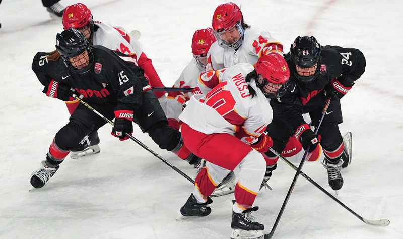 中国队球员吴思嘉(前左)在第九届亚冬会女子冰球小组赛A组比赛中拼抢 (2025年2月14日摄)颜麟蕴摄/本刊
