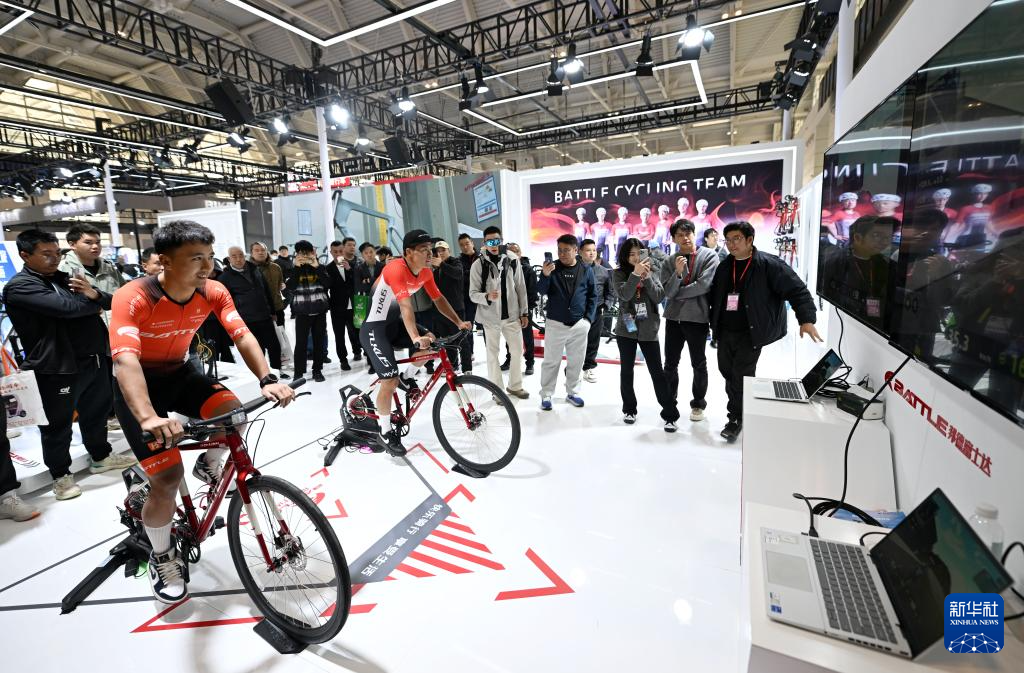 3月28日,观众在自行车展区体验竞速。新华社记者 赵子硕 摄