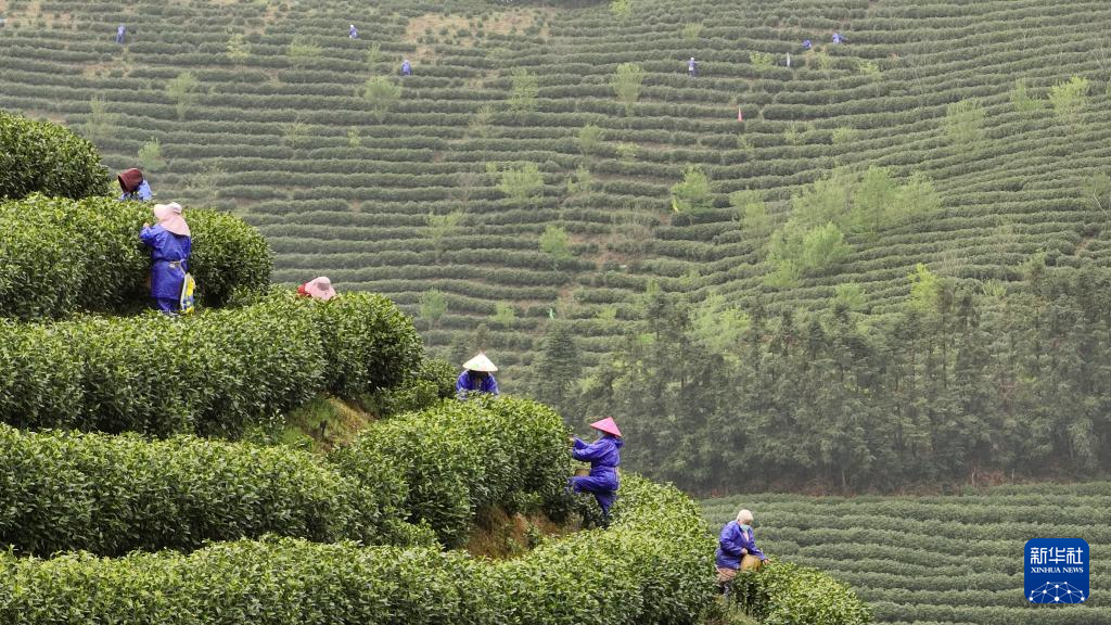 3月29日,在浙江省台州市仙居县横溪镇阳峰山生态茶场,茶农忙着采摘明前茶。新华社发(王华斌摄)