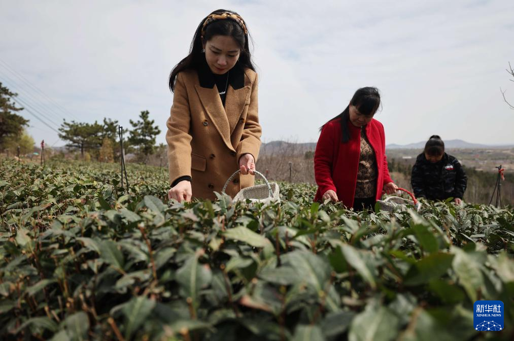 3月29日,山东省临沂市沂南县铜井镇龙泉村茶农在农场采摘明前茶。新华社发(王彦冰 摄)