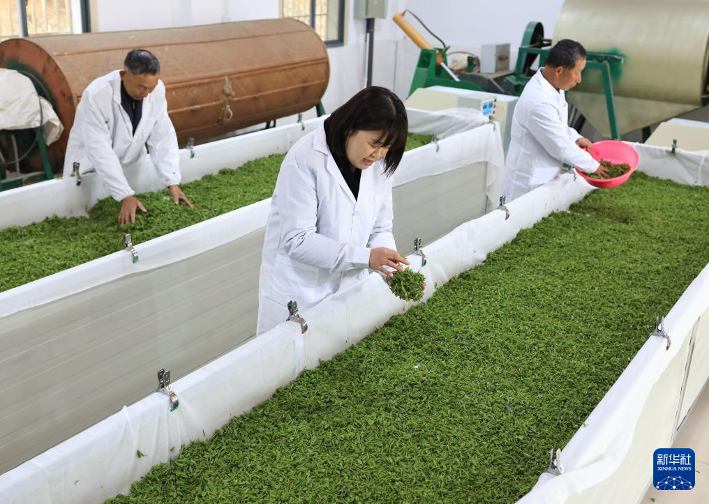 3月29日,在湖北省武汉市黄陂区木兰湖绿岛茶园制茶工厂,工人在摊晾茶青。新华社发(赵军 摄)