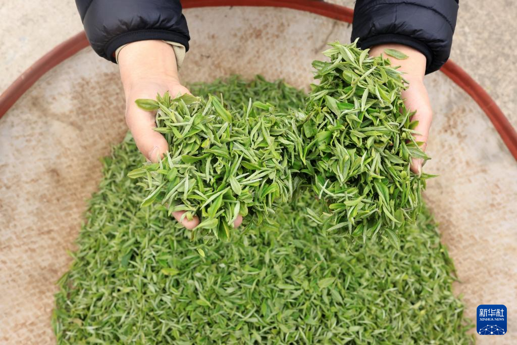 3月29日,在湖北省武汉市黄陂区木兰湖绿岛茶园,茶厂工作人员展示明前茶嫩芽。新华社发(赵军 摄)