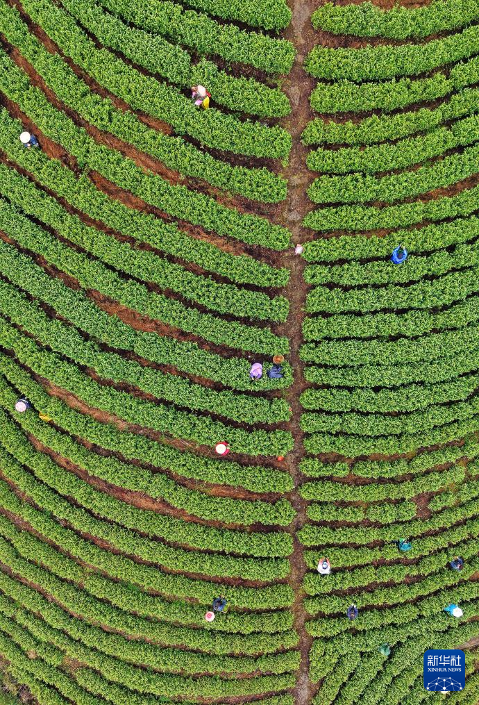 3月29日,在浙江省台州市仙居县横溪镇阳峰山生态茶场,茶农忙着采摘明前茶(无人机照片)。新华社发(王华斌摄)