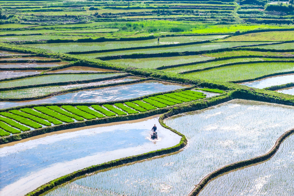 ↑ 5月12日,在湖南省娄底市双峰县井字镇石奇村,农民驾驶微耕机整田,准备插秧(无人机照片)。新华社发(李建新摄)