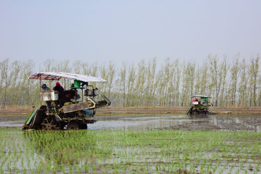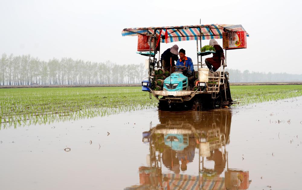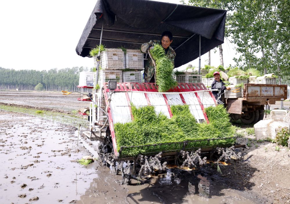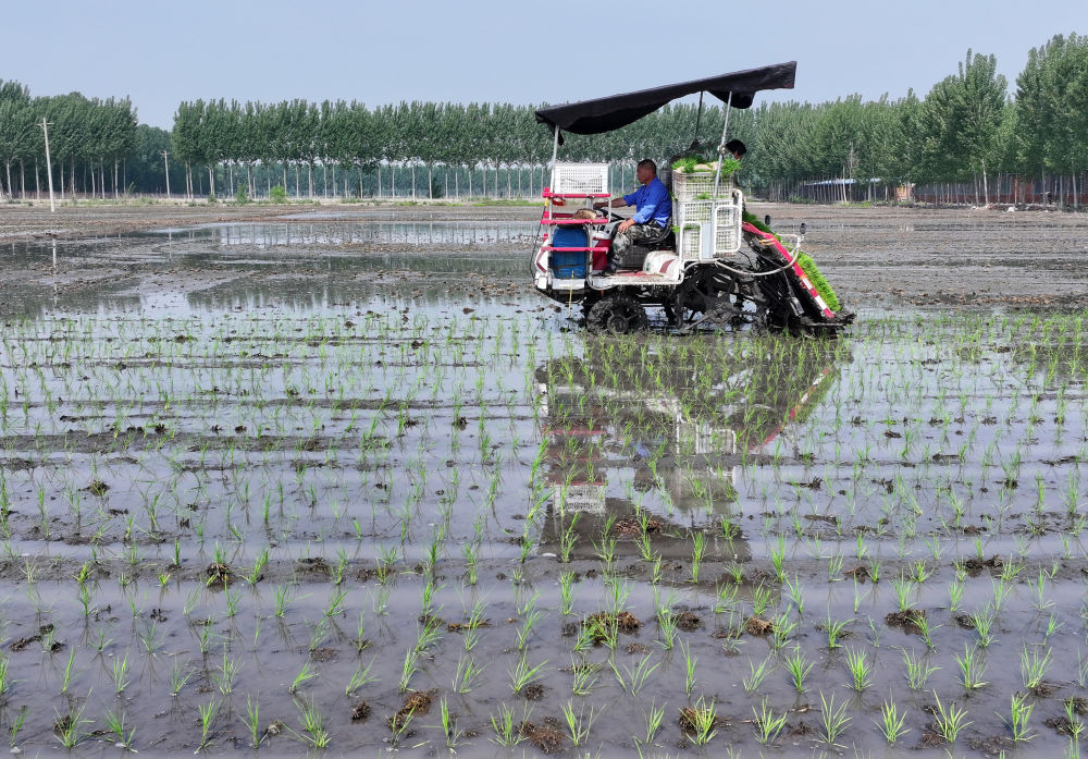 ↑ 5月13日,河北省唐山市丰南区岔河镇一水稻种植合作社的社员在田间驾驶农机进行水稻插秧作业。新华社记者 杨世尧 摄