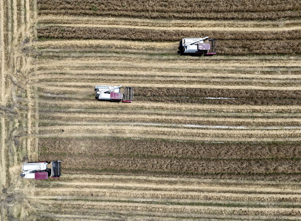 ↑ 5月12日,浙江省余姚市黄家埠镇韩夏村农民在田间收割油菜(无人机照片)。新华社发(张辉摄)