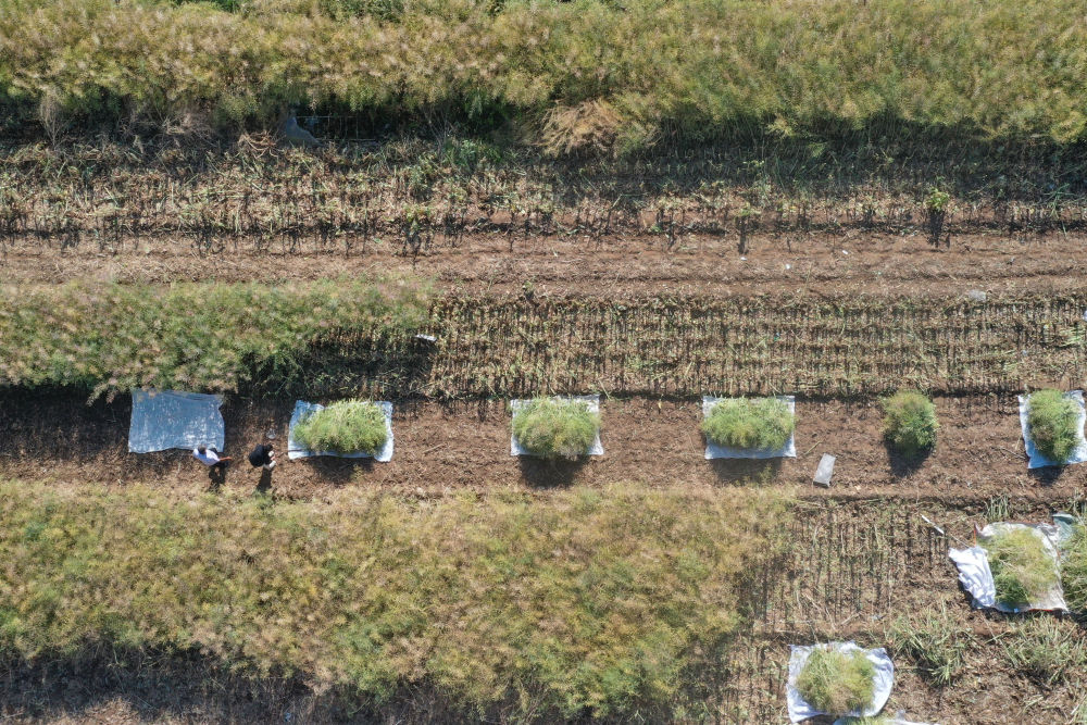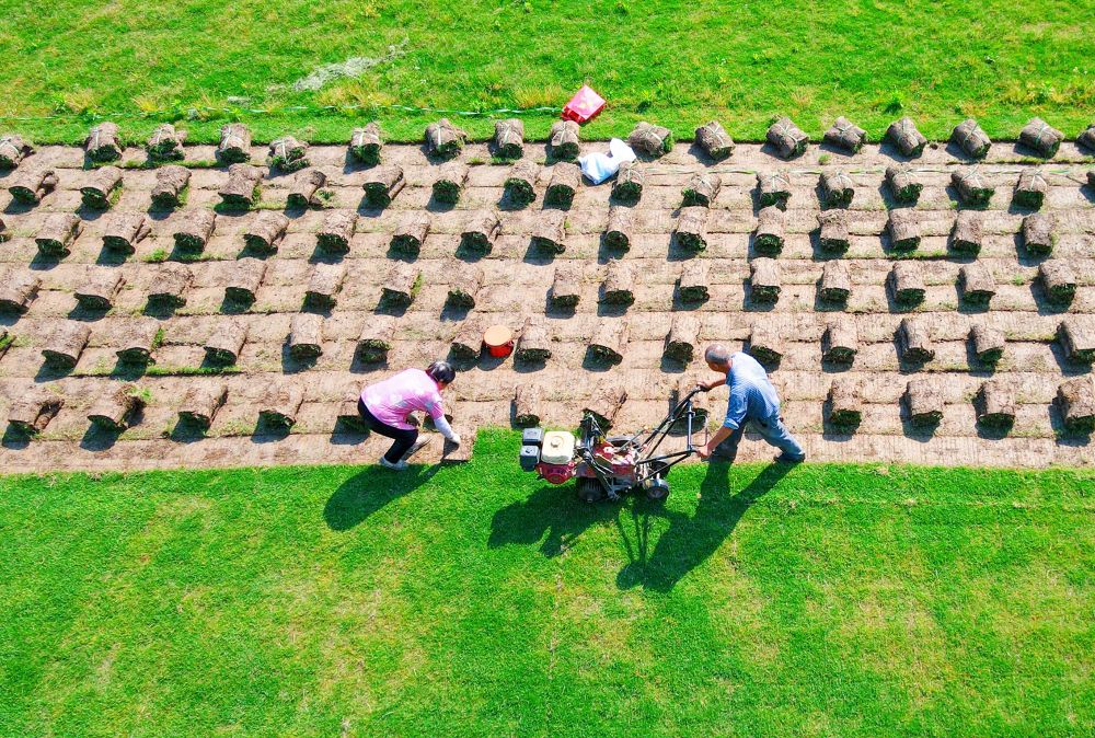 ↑ 5月11日,村民在江苏省如皋市如城街道钱长村草坪种植基地铲收草皮(无人机照片)。新华社发(吴树建摄)