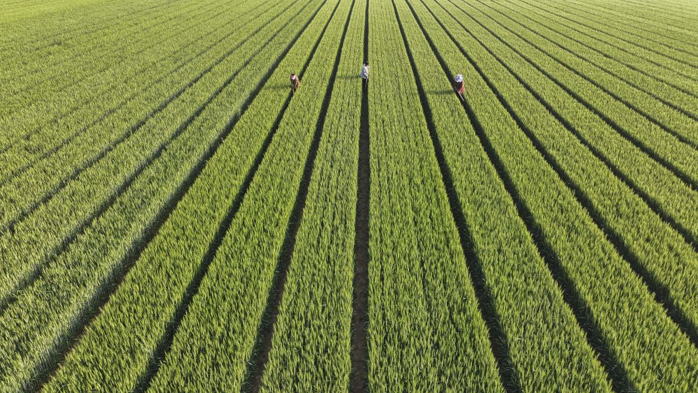 ↑ 5月13日,河北省遵化市东新庄镇农民在麦田锄草(无人机照片)。新华社发(刘满仓摄)