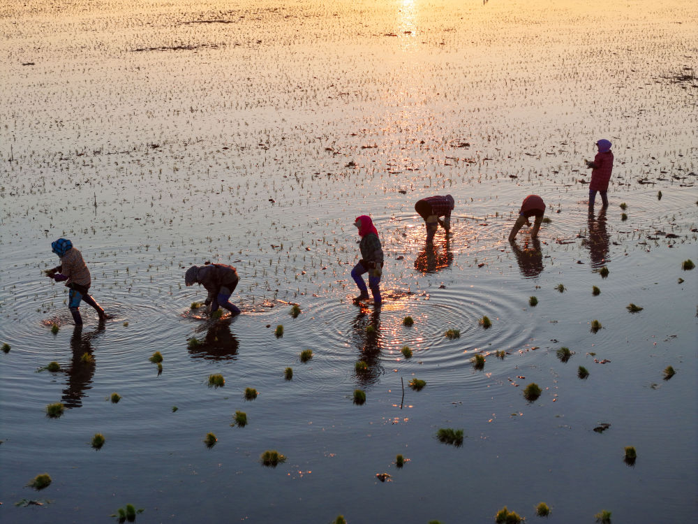 ↑ 5月12日,在湖南省娄底市双峰县井字镇石奇村,农民在田间拔秧苗。新华社发(李建新摄)