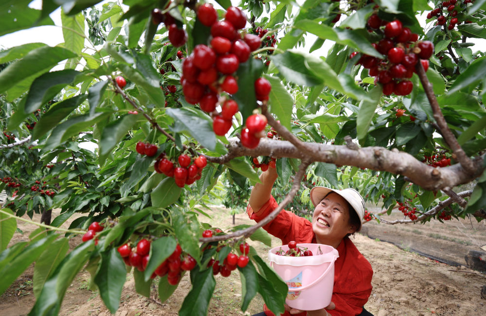 ↑ 5月13日,山东省临沂市郯城县郯城街道薛城后村村民在采摘大樱桃。新华社发(张春雷摄)