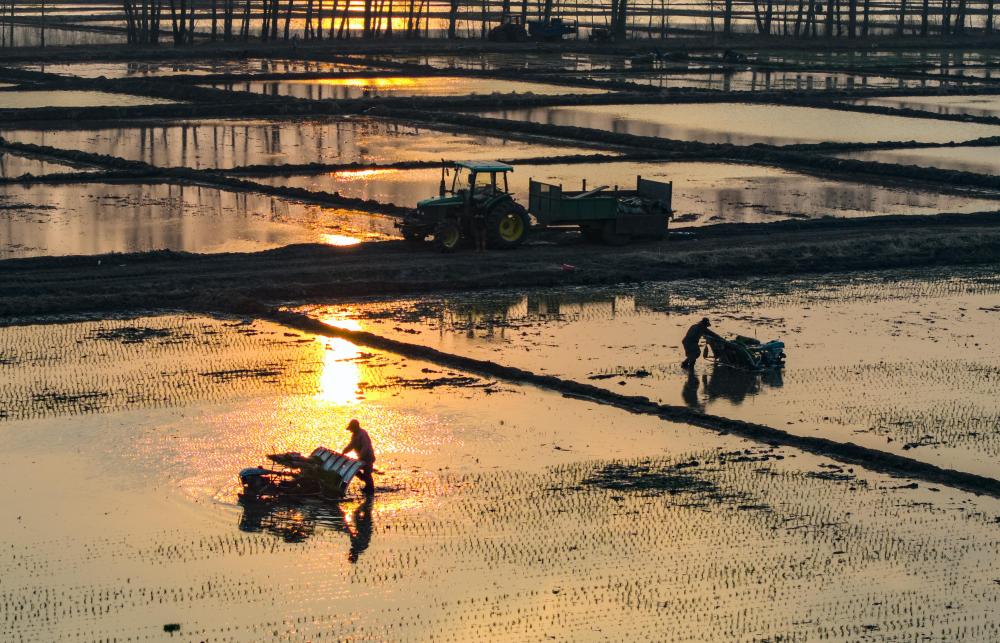 ↑ 5月13日,河北省唐山市丰南区岔河镇一水稻种植合作社的社员将水稻秧苗装车,准备运到田间插播。新华社记者 杨世尧 摄