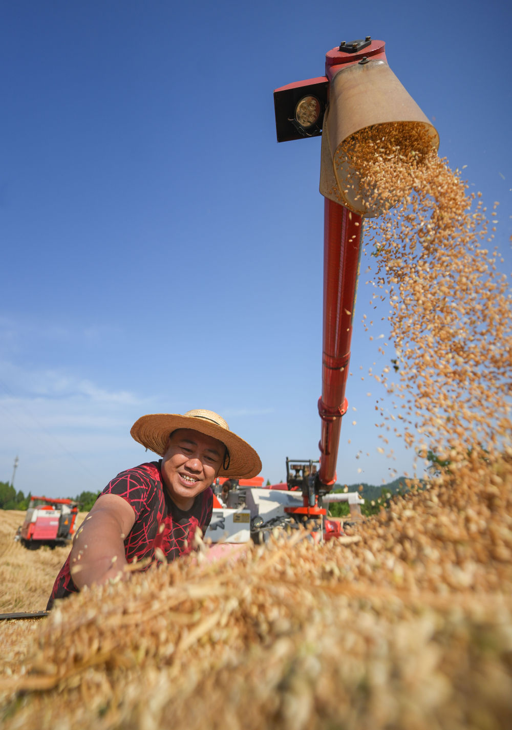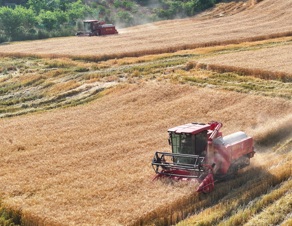 ↑ 5月12日,农户在四川省射洪市沱牌镇桃花村收割小麦。新华社发(刘昌松摄)