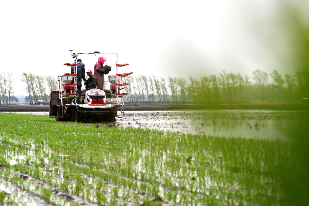 ↑ 5月12日,在北大荒集团黑龙江共青农场有限公司河北庄管理区,种植户驾驶插秧机进行水稻插秧作业。新华社发(李昂摄)