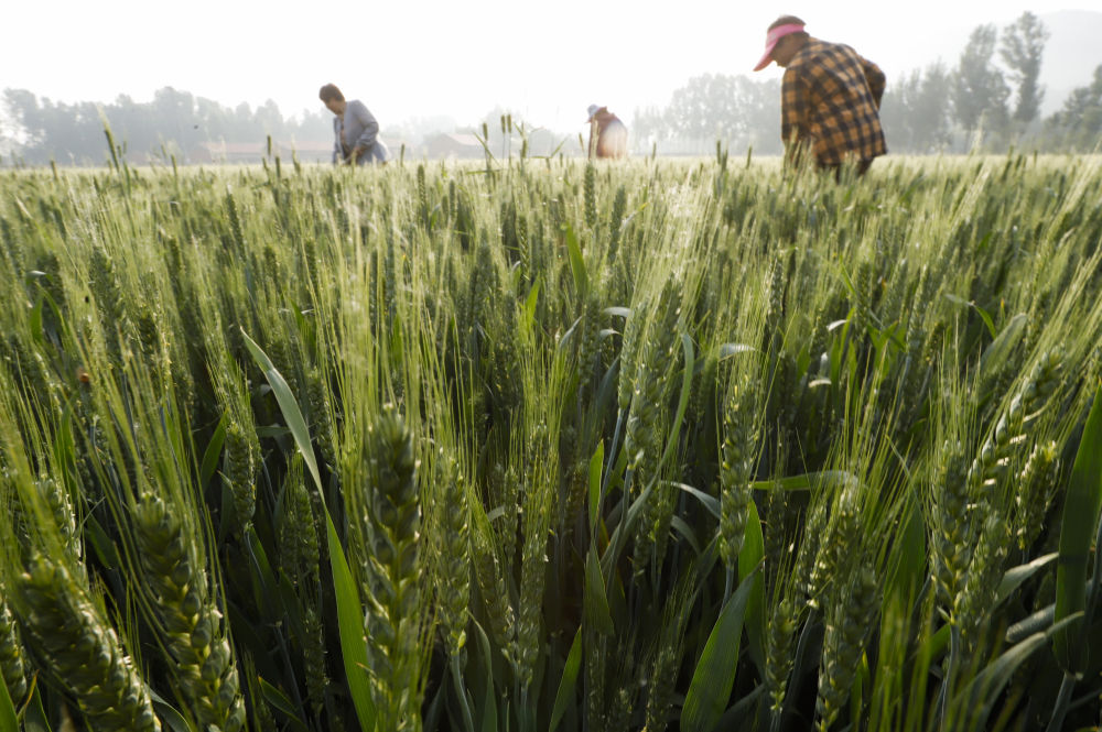 ↑ 5月13日,农民在河北省遵化市东新庄镇的麦田锄草。新华社发(刘满仓摄)