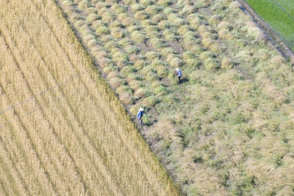 ↑ 5月11日,河南省焦作市温县温泉街道东梁所村村民在田间采收油菜(无人机照片)。新华社发(徐宏星摄)