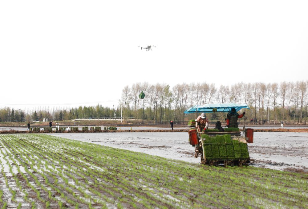 ↑ 5月11日,在北大荒集团黑龙江七星农场有限公司第六管理区的水稻田内,无人机给插秧机运送秧苗。新华社发(党爱河摄)