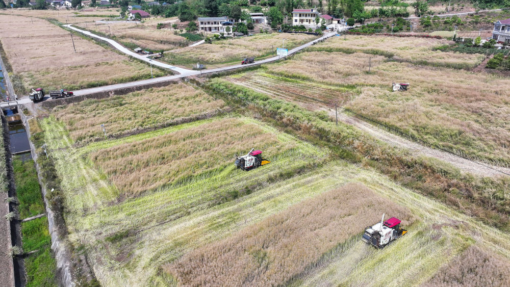 ↑ 5月12日,在四川省阆中市柏垭粮油现代农业产业园区内,农机手驾驶收割机收获油菜(无人机照片)。新华社发(王玉贵摄)