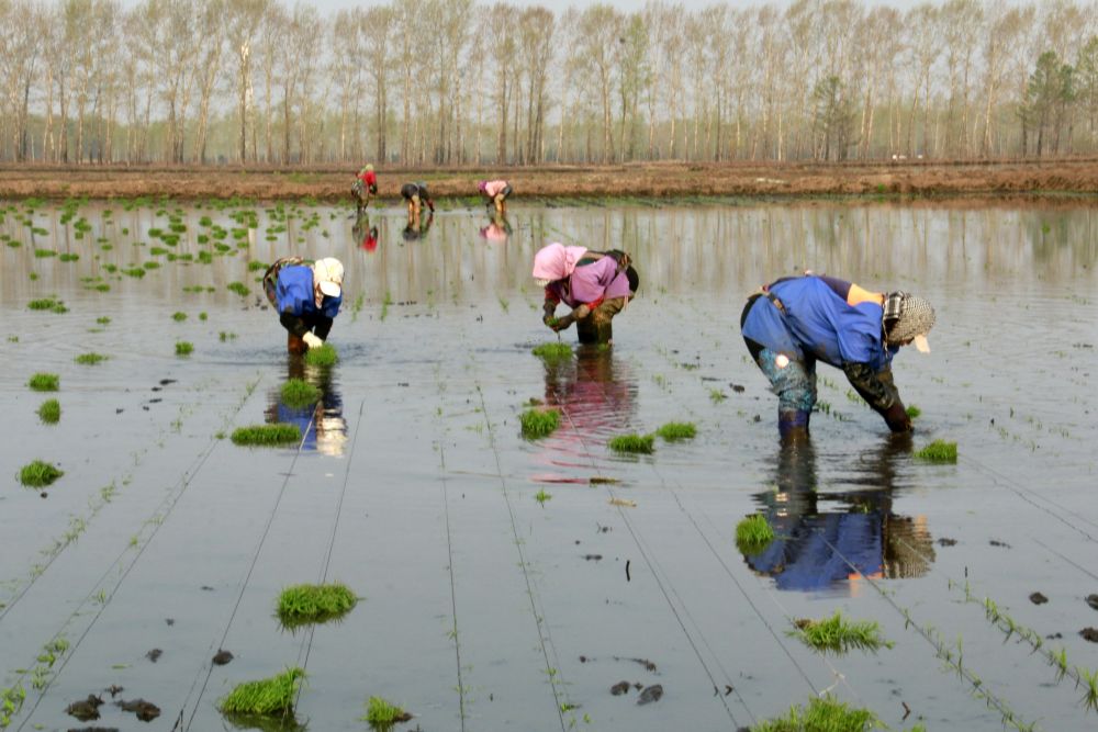 ↑ 5月13日在北大荒集团黑龙江龙镇农场有限公司一处稻田拍摄的插秧现场。新华社发(陆文祥摄)