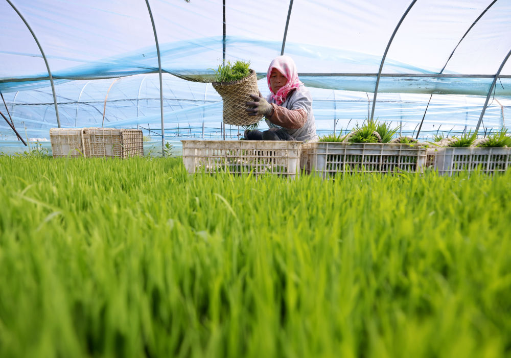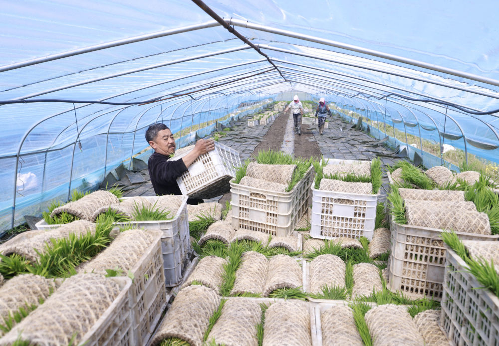 ↑ 5月13日,河北省唐山市丰南区岔河镇一水稻种植合作社的社员在水稻育苗棚内起秧苗。新华社记者 杨世尧 摄