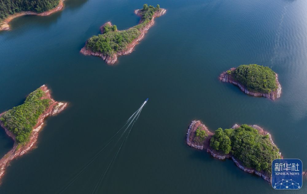 ↑ 夕阳下的千岛湖景区(6月3日摄)。