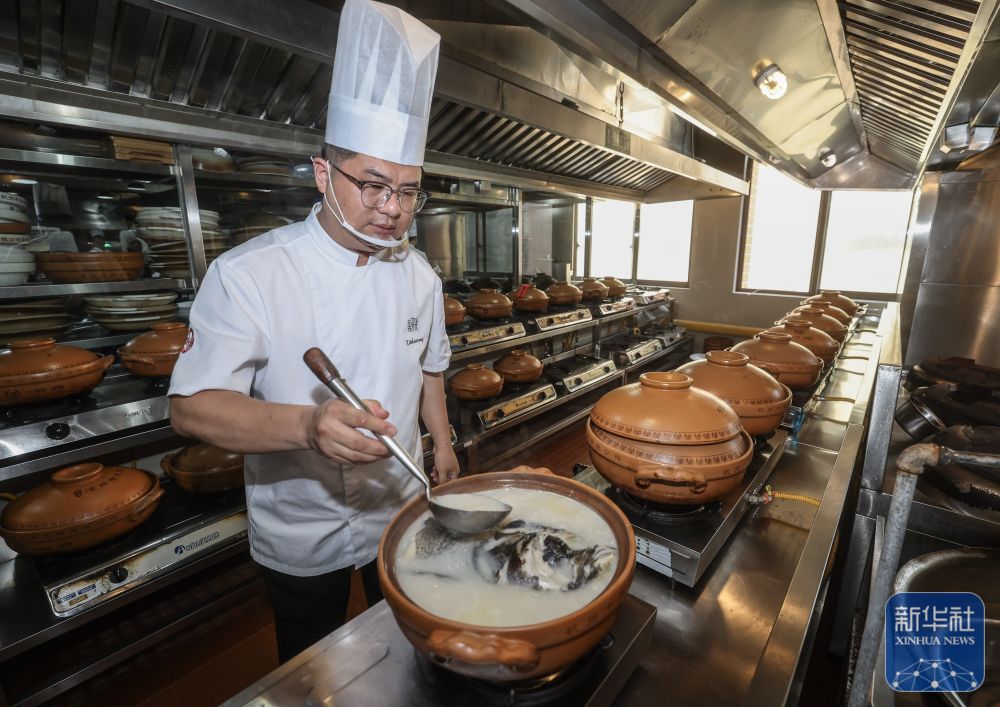 ↑ 6月3日,淳安千岛湖鱼味馆的厨师在烹饪当地特色美食千岛湖鱼头。