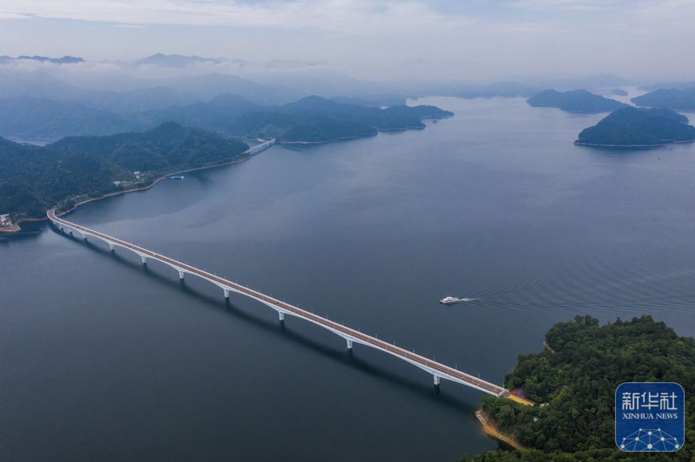 ↑ 空中俯瞰千岛湖上江埠大桥(6月4日摄,无人机照片)。