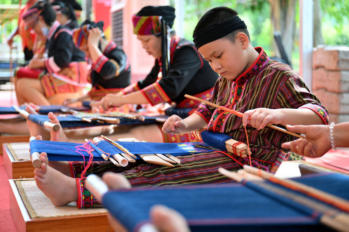 2022年6月11日,一名来自五指山市的黎族小朋友在三亚南山非遗节展示黎族织锦技艺。新华社记者 郭程 摄