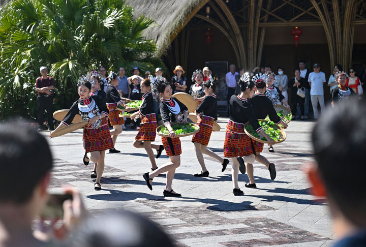 2024年2月14日,五指山市水满乡毛纳村歌舞队为游客表演黎族舞蹈。新华社记者 郭程 摄