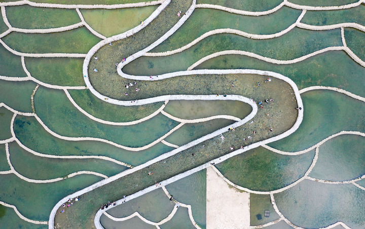 2025年6月7日,市民和游客在五指山市小岛公园鱼鳞坝游玩(无人机照片)。新华社记者 郭程 摄