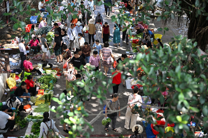 2025年6月7日,市民和游客在五指山市逛“消费助农周末集市”。新华社记者 郭程 摄