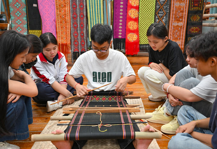 2025年6月10日,在位于五指山市的海南省民族技工学校,老师(中)教学生黎族织锦。新华社记者 郭程 摄