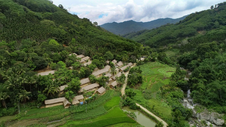 这是2024年2月14日拍摄的坐落在五指山下的水满乡毛纳村(无人机照片)。新华社记者 郭程 摄