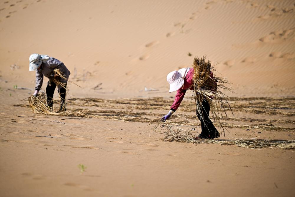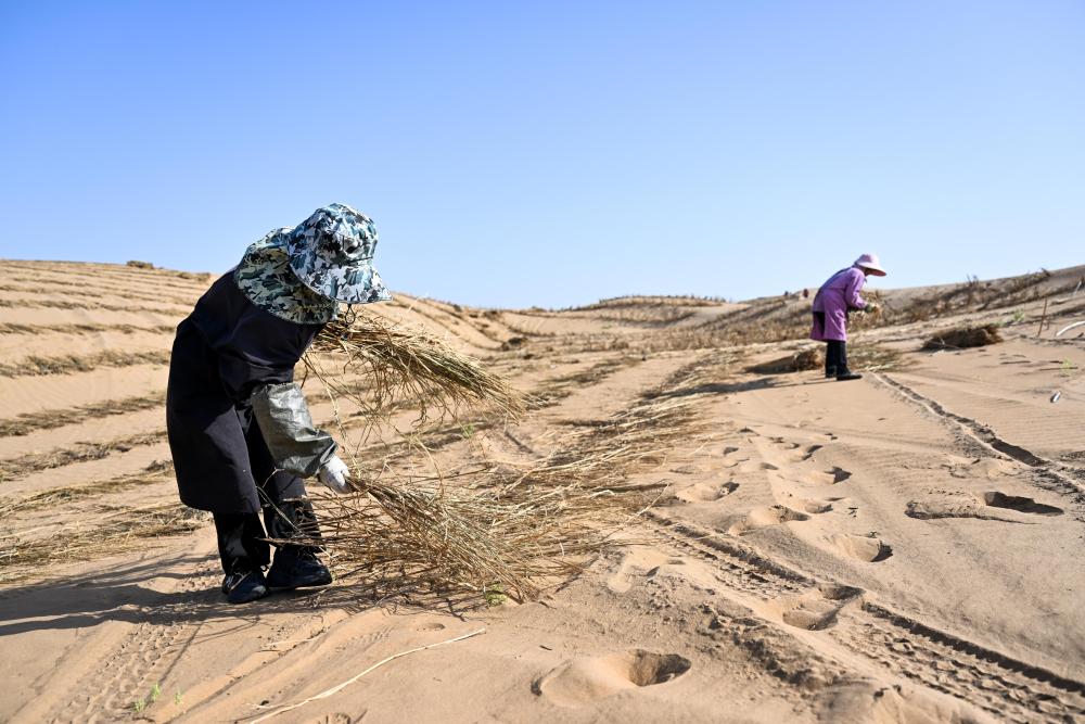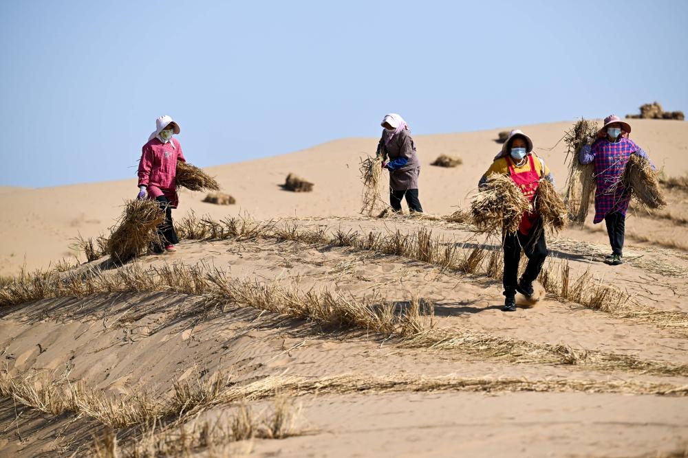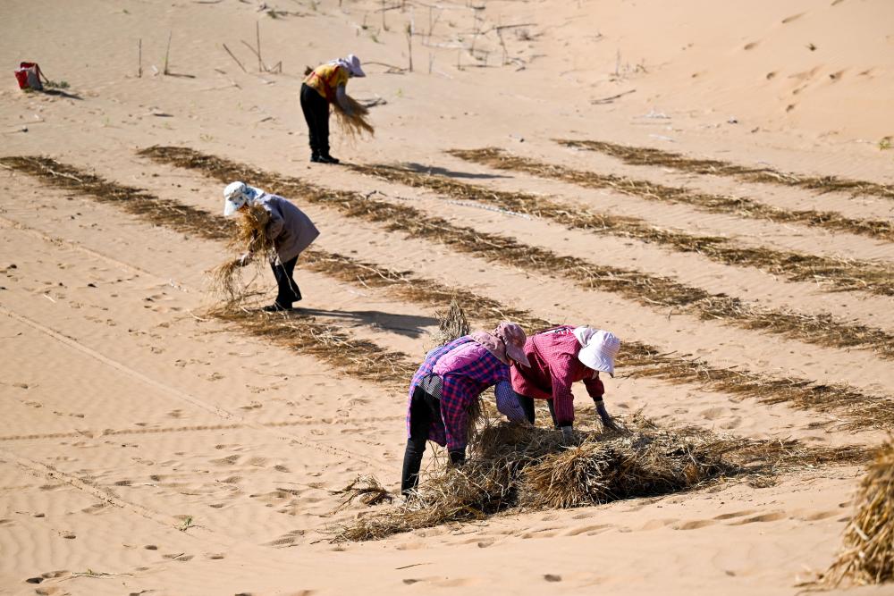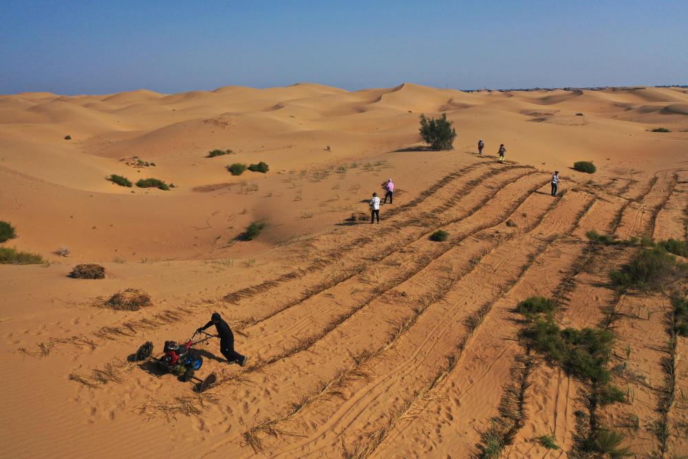 秋日,在内蒙古鄂尔多斯市杭锦旗境内的库布其沙漠,治沙工人忙碌地铺设沙障,进行库布其沙漠治理。近年来,杭锦旗有序推进荒漠化防治工作,实施建设库布其沙漠锁边林草带、风沙路径阻隔带、光伏治沙带等治沙项目,促进库布其沙漠生态环境改善。新华社记者 李志鹏 摄影报道