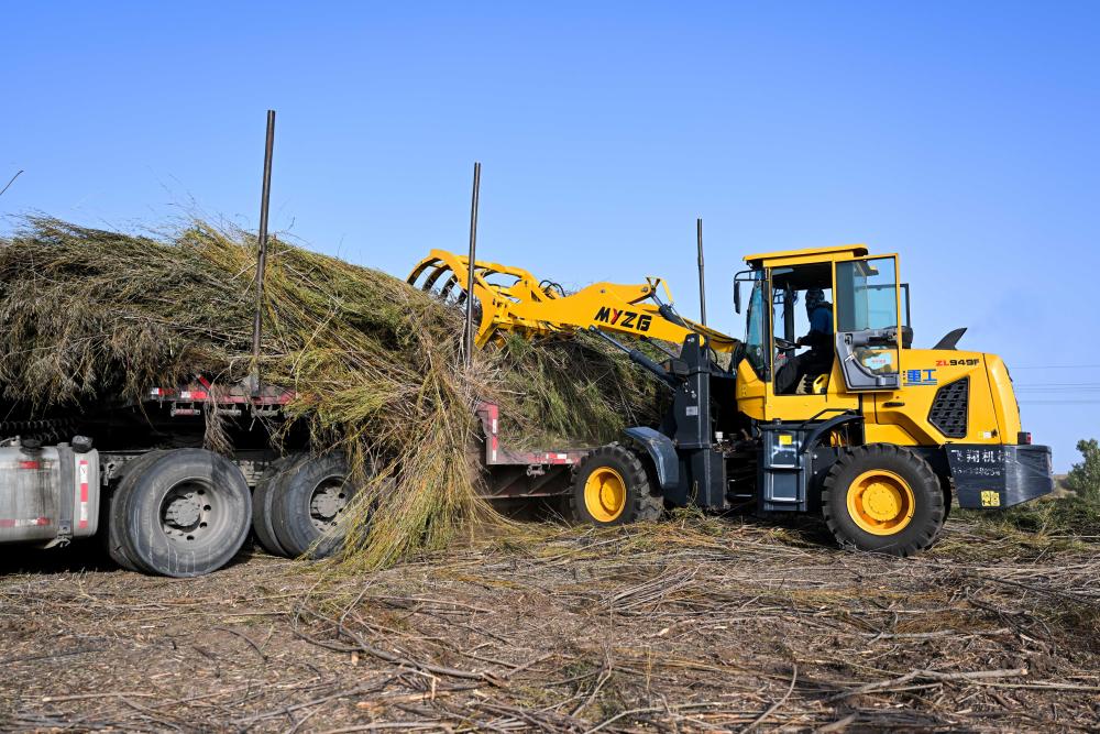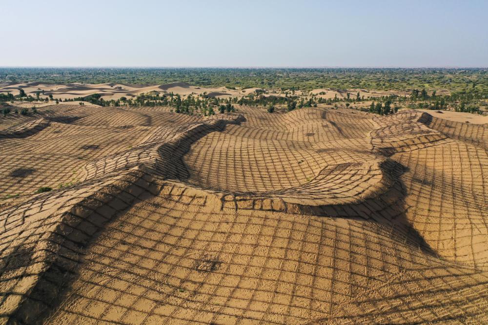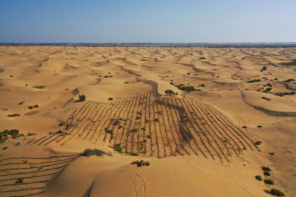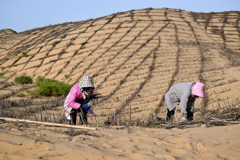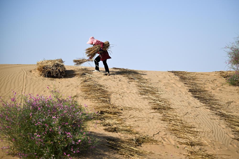 秋日,在内蒙古鄂尔多斯市杭锦旗境内的库布其沙漠,治沙工人忙碌地铺设沙障,进行库布其沙漠治理。近年来,杭锦旗有序推进荒漠化防治工作,实施建设库布其沙漠锁边林草带、风沙路径阻隔带、光伏治沙带等治沙项目,促进库布其沙漠生态环境改善。新华社记者 李志鹏 摄影报道