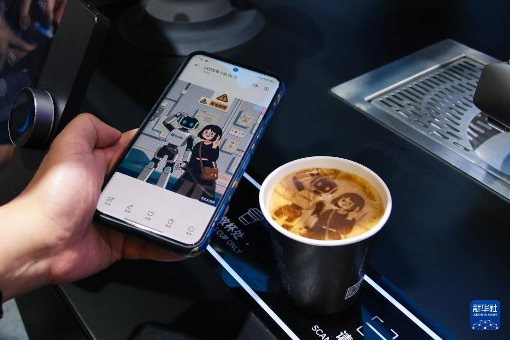9月19日,在南宁国际会展中心,参观者展示一款由咖啡机器人制作的咖啡拉花。新华社记者 胡秋思 摄