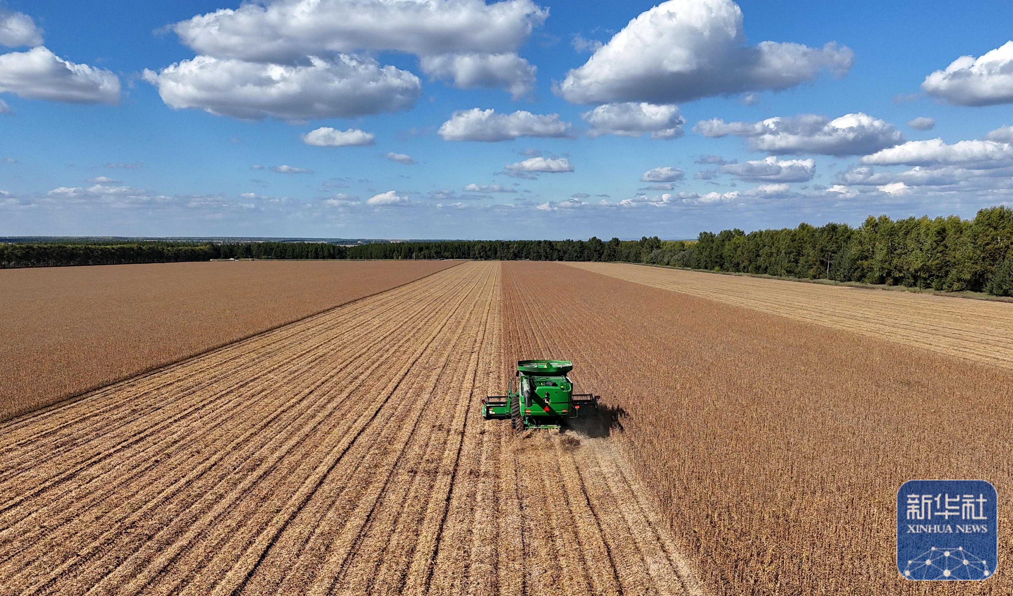 9月19日,在北大荒集团黑龙江格球山农场有限公司大豆地块,收获机车在进行收获作业(无人机照片)。新华社发(陆文祥摄)