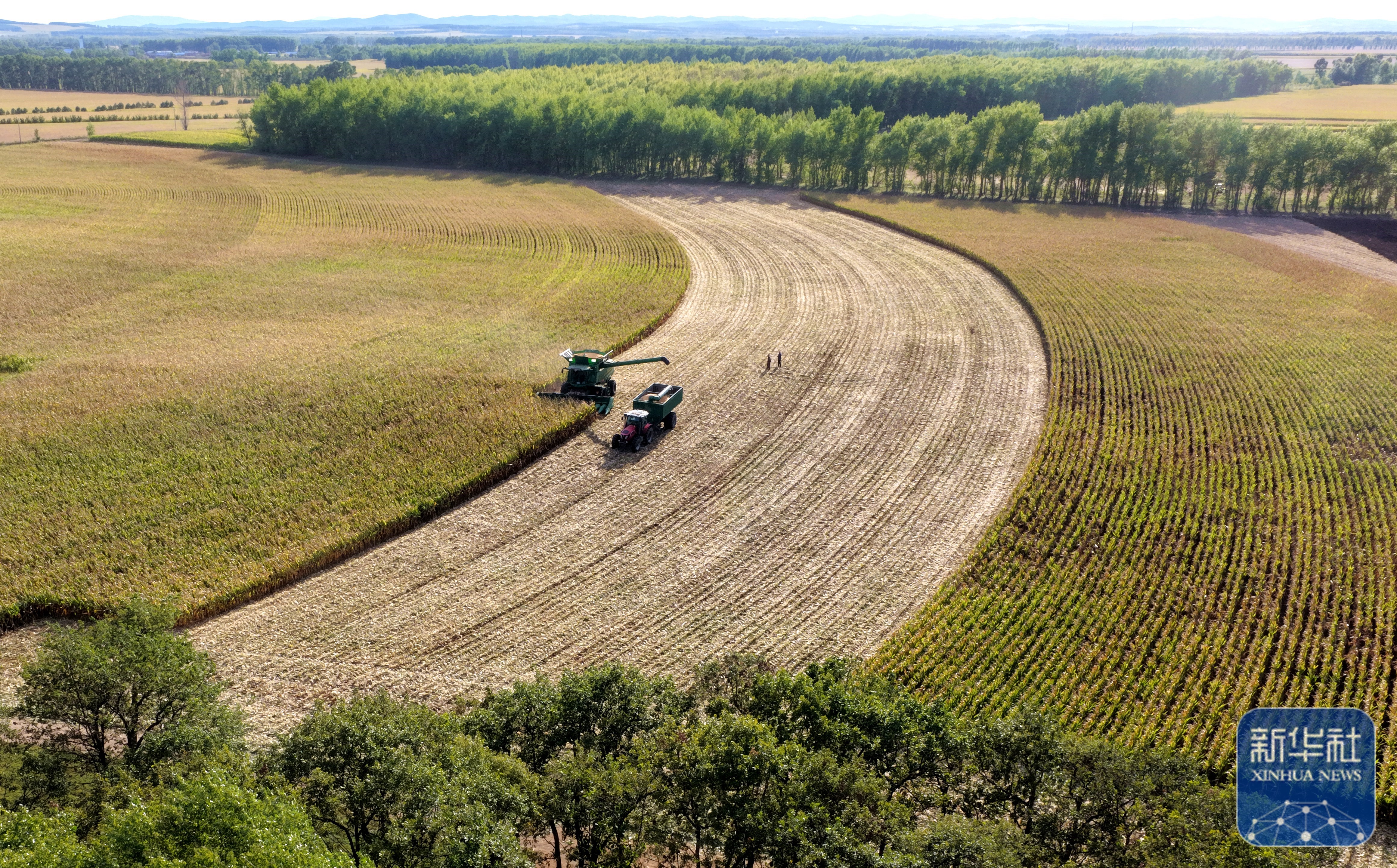 9月18日,在黑龙江北大荒农业股份有限公司友谊分公司第七管理区,大型收获机车在收获玉米(无人机照片)。新华社发(徐宏宇摄)