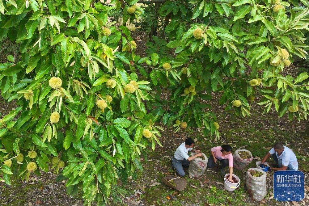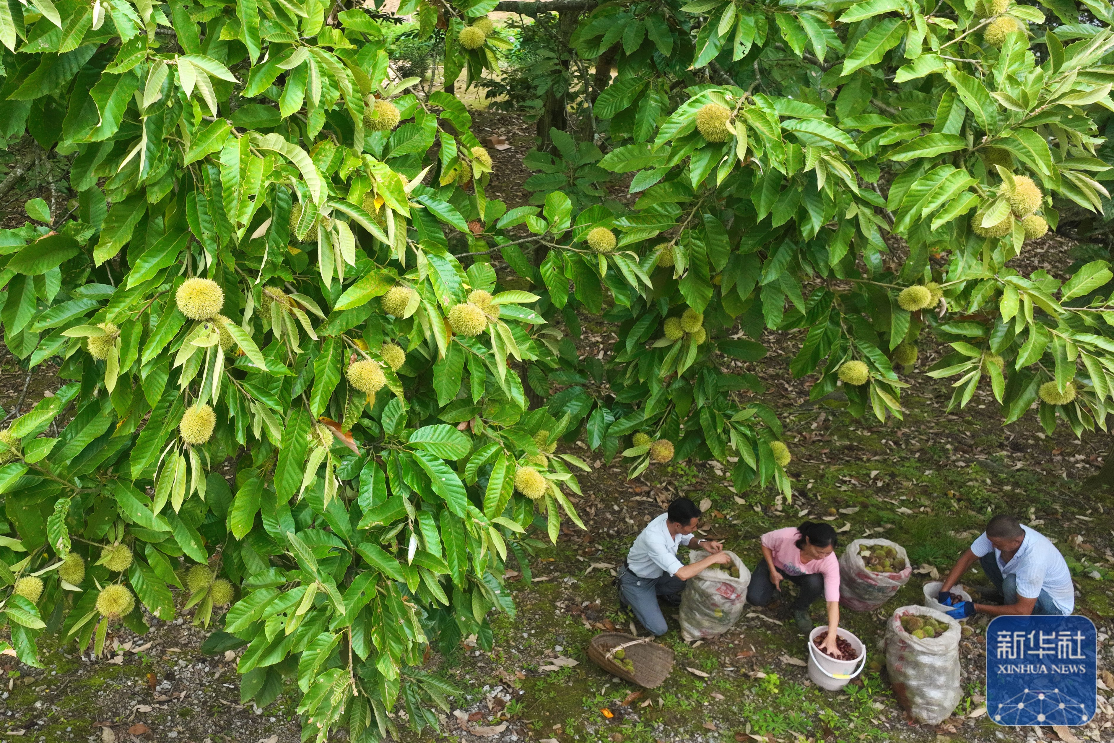 9月19日,重庆市黔江区石家镇火石垭村村民在采收板栗(无人机照片)。新华社发(杨敏摄)