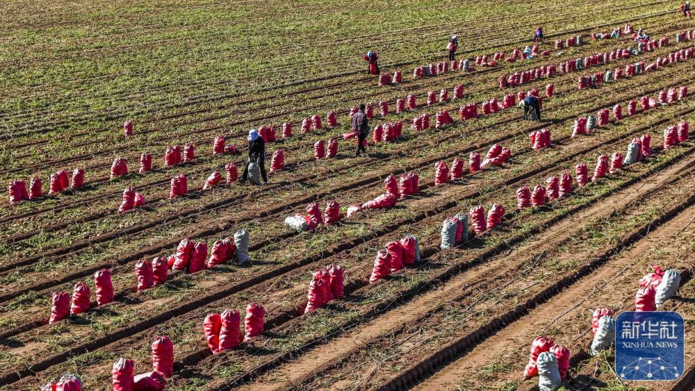 9月19日,河北省承德市丰宁满族自治县大滩镇农民在收获马铃薯(无人机照片)。新华社发(刘满仓摄)