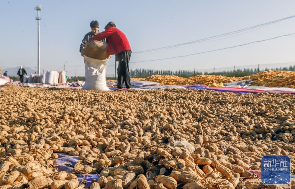 9月20日,河北省遵化市东新庄镇农民在场院将晒干的花生装袋。新华社发(刘满仓摄)