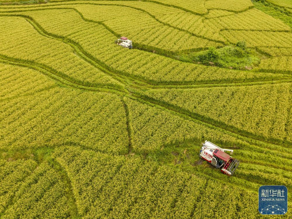 9月18日,在广西贺州市钟山县红花镇古楼村,农民驾驶收割机在收割稻谷(无人机照片)。新华社发(何华文摄)