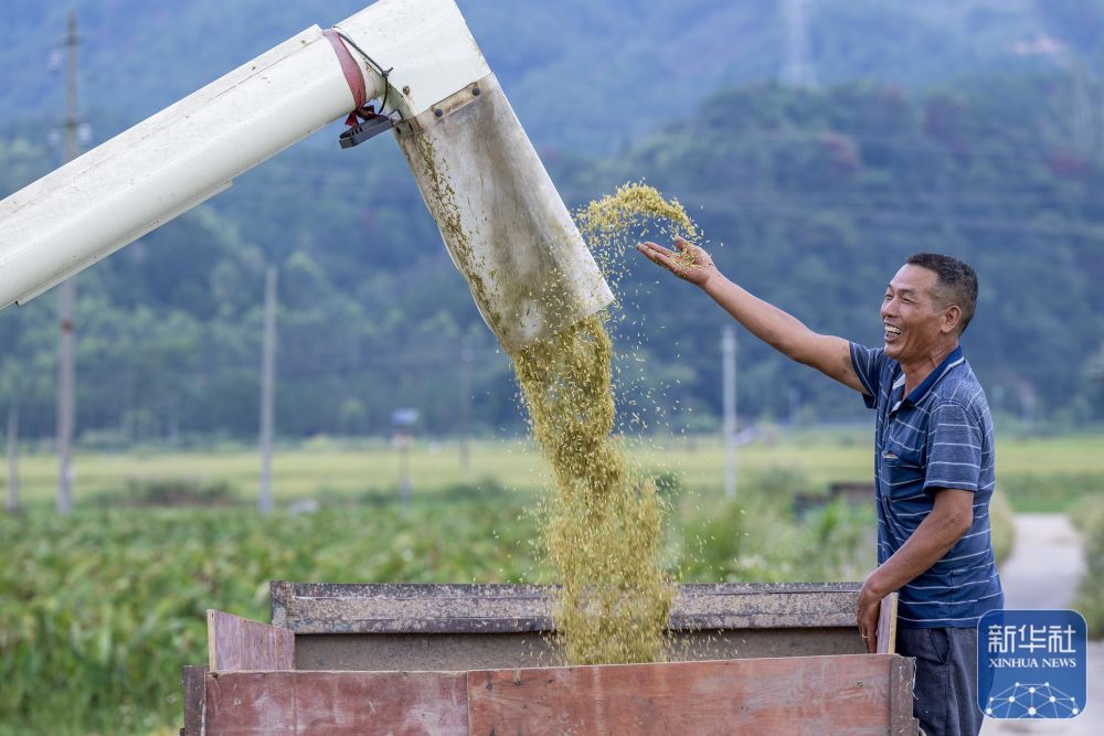 9月18日,在广西贺州市钟山县红花镇古楼村,农民在收获稻谷。新华社发(何华文摄)