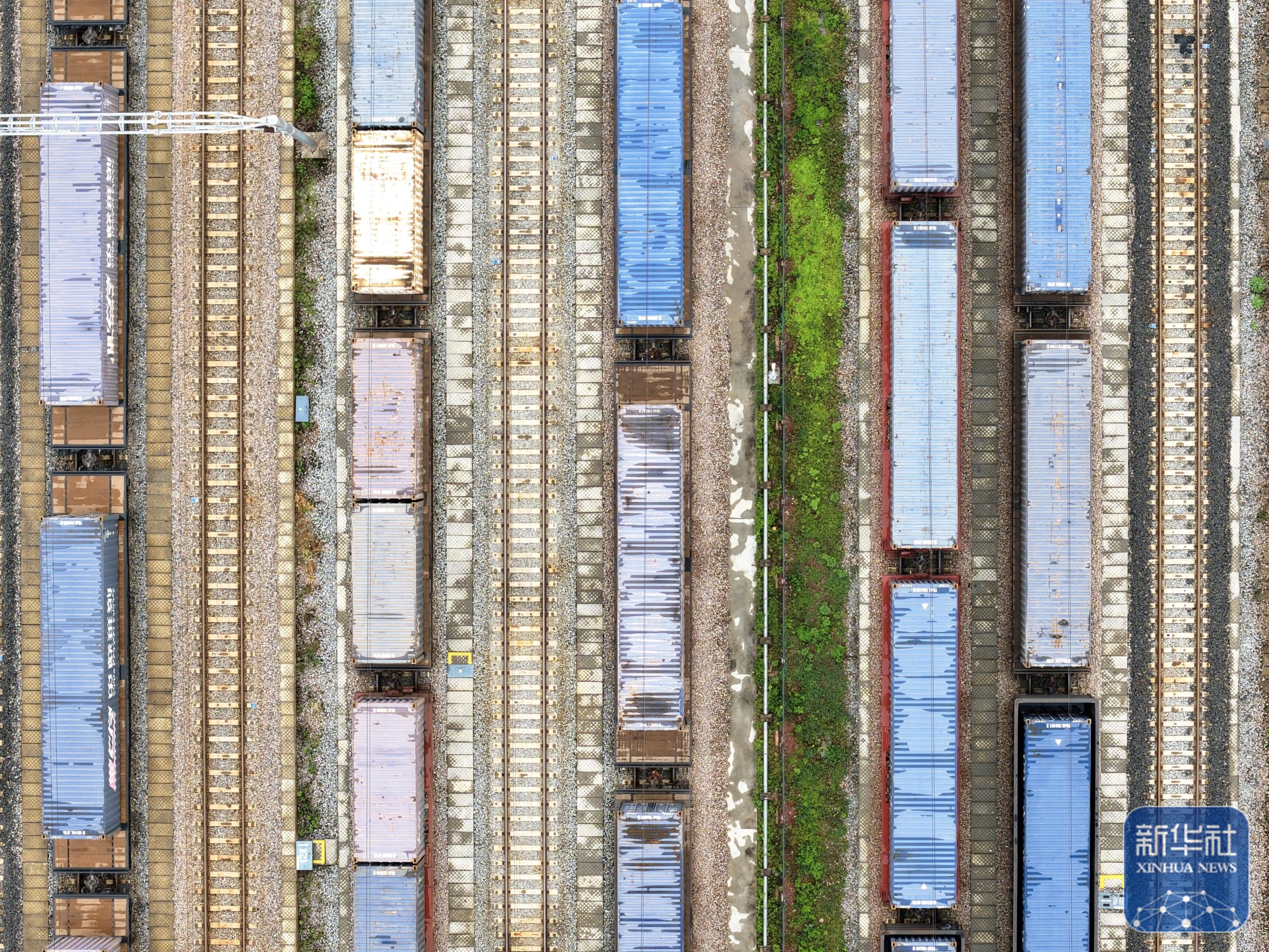 ↑ 9月21日,中老铁路上的货运列车在磨憨站通过(无人机照片)。新华社记者 邢广利 摄影报道
