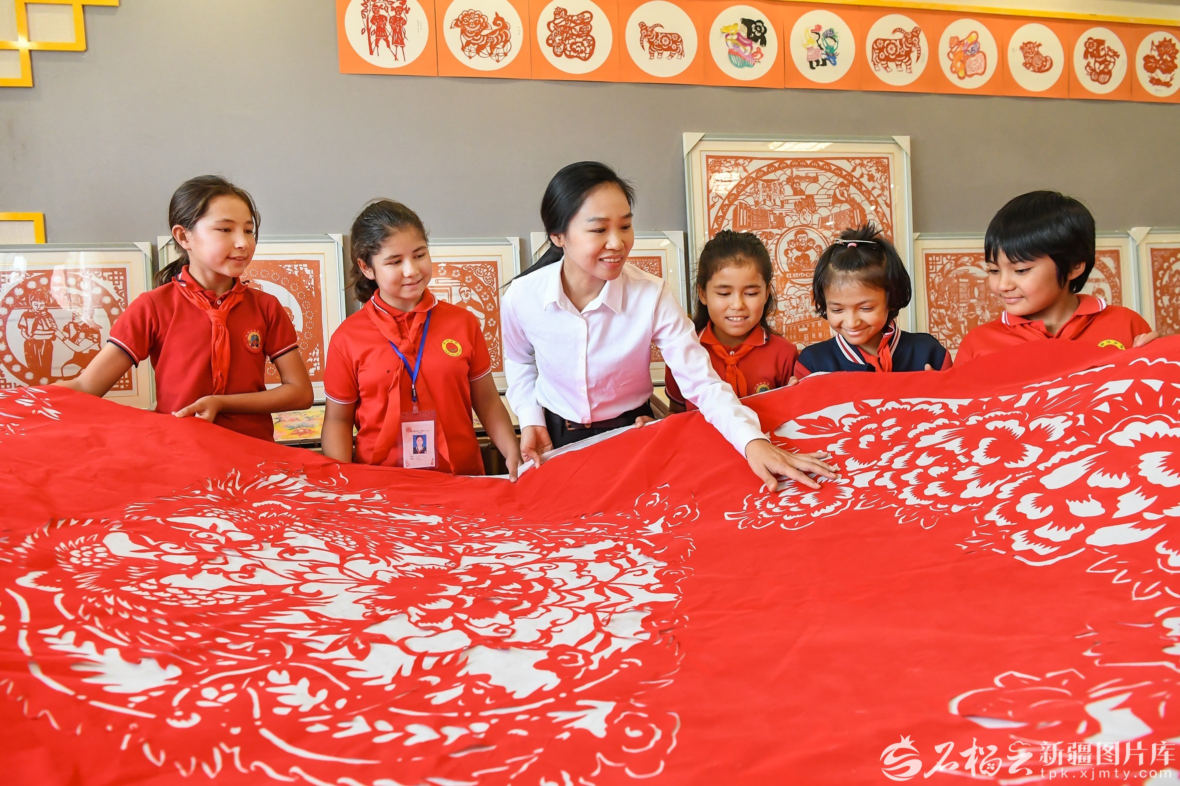 为庆祝新疆维吾尔自治区成立70周年,疏附县托克扎克镇中心小学剪纸社团精心创作了3米长的巨幅剪纸作品,表达对祖国的热爱和对家乡的祝福(9月19日摄)。天山网-新疆日报记者约提克尔·尼加提摄