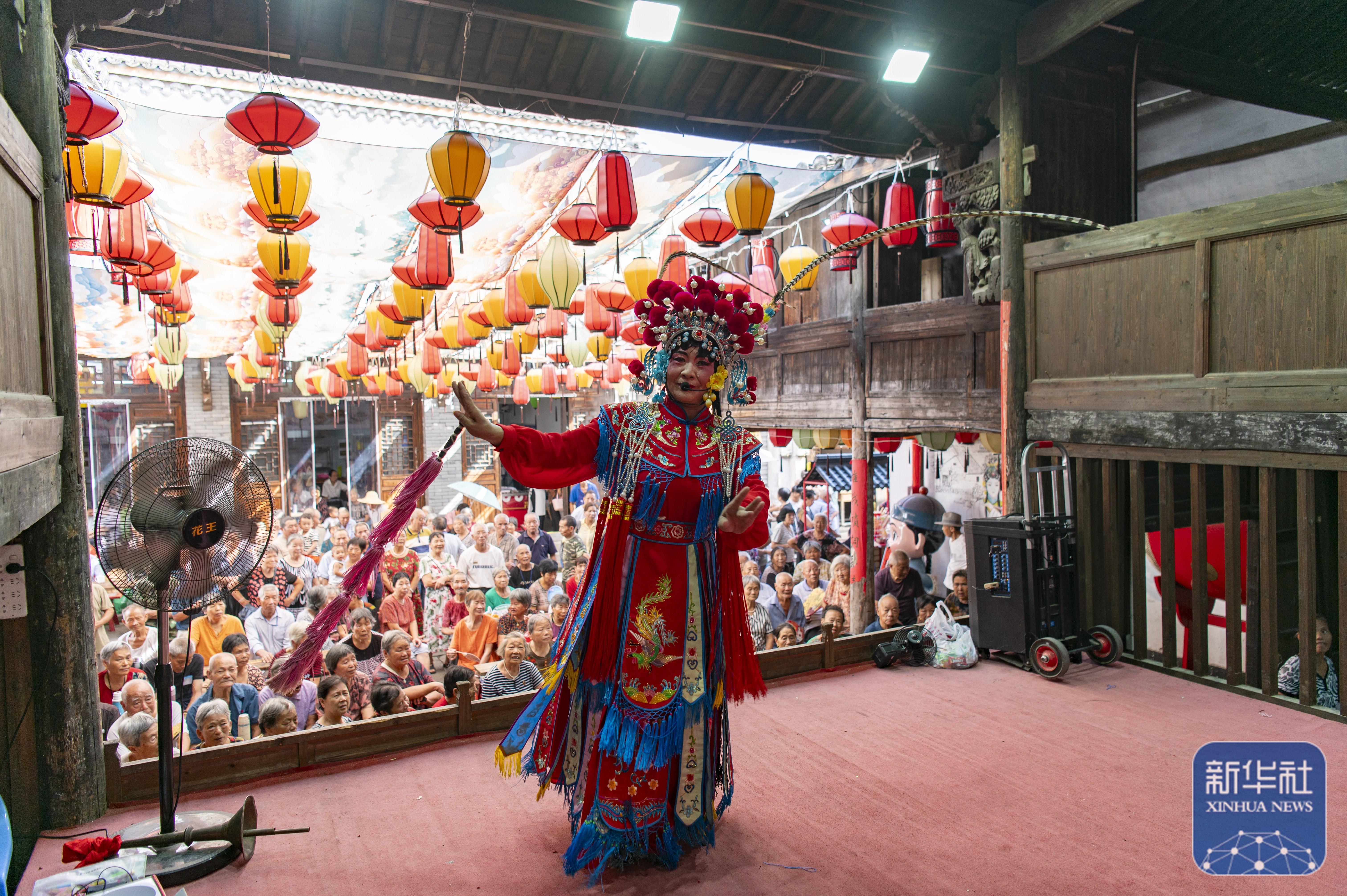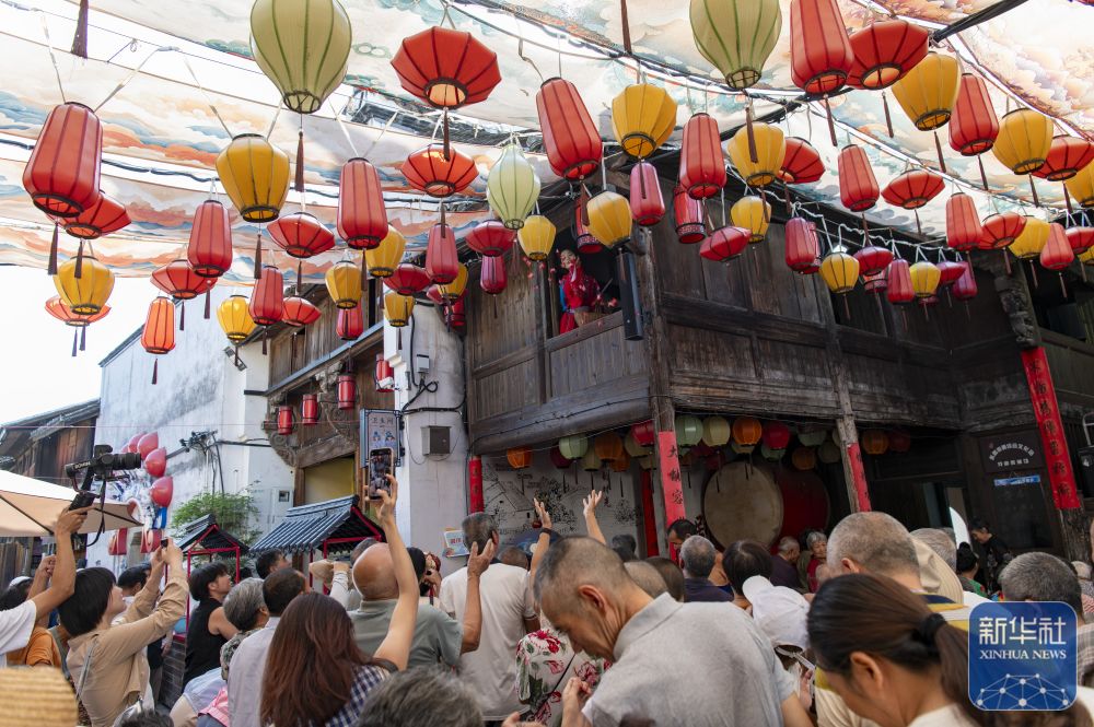↑ 9月26日,在浙江省兰溪市永昌古镇李渔风情街上,当地居民和游客在欣赏婺剧表演。新华社发(胡肖飞摄)