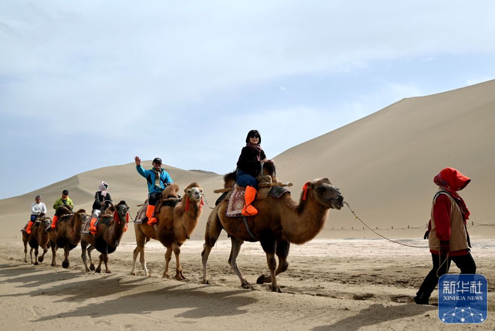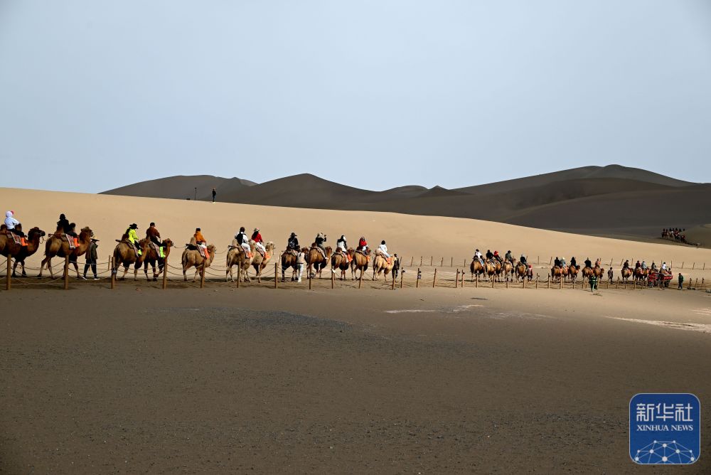 ↑ 9月25日,游客在甘肃省敦煌市鸣沙山月牙泉景区游览。新华社发(张晓亮摄)