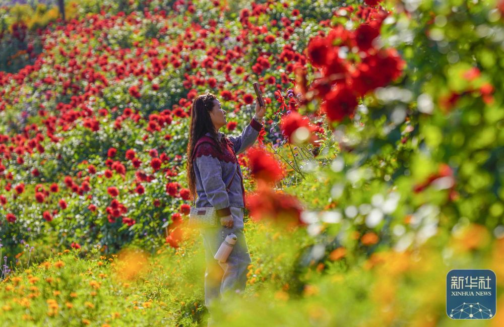 ↑ 9月26日,游客在河北省承德市兴隆县南天门乡高山花海景区赏花拍照。新华社发(刘满仓摄)