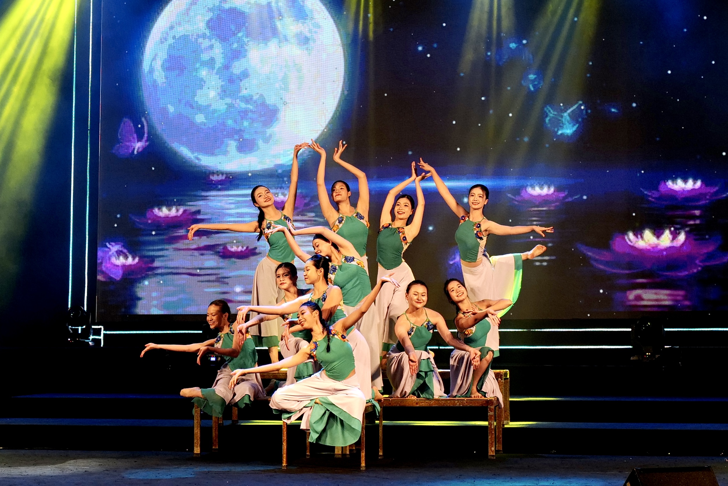9月25日,在越南河内越南国家歌舞剧院,越南演员在2025年中越中秋文艺晚会上表演舞蹈。