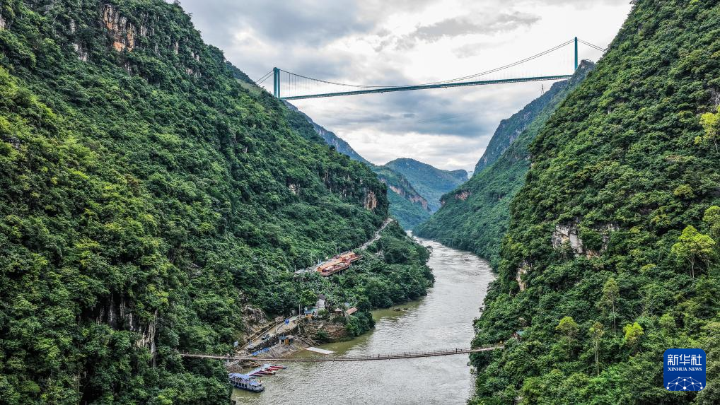 景区内的索道桥与远处的花江峡谷大桥遥相呼应(9月27日摄,无人机照片)。