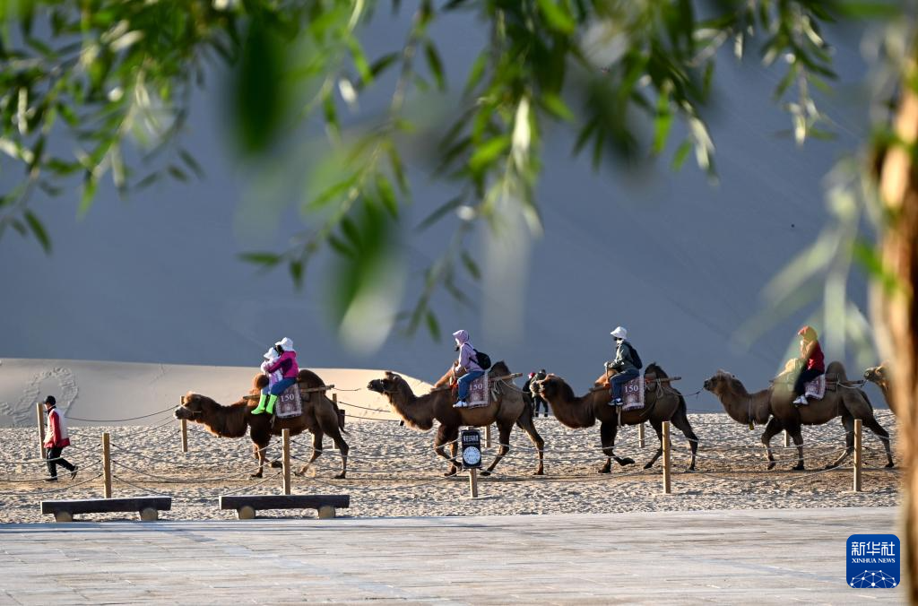 10月1日,游客在甘肃省敦煌市鸣沙山月牙泉景区游览。新华社发(张晓亮 摄)